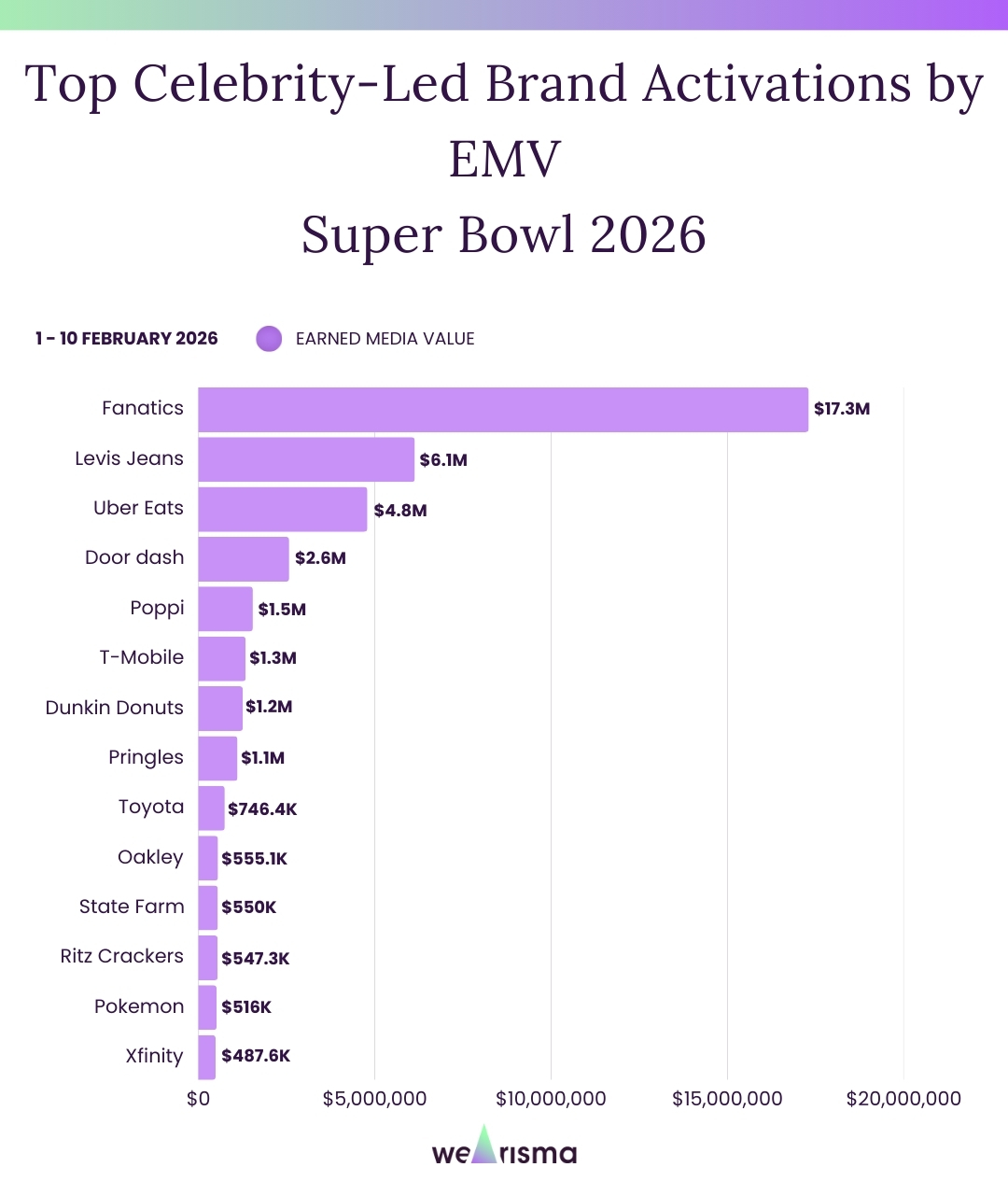 A data-led breakdown of the celebrity-led brand activations that generated the highest Earned Media Value (EMV) in the first 48 hours of Super Bowl 2026.