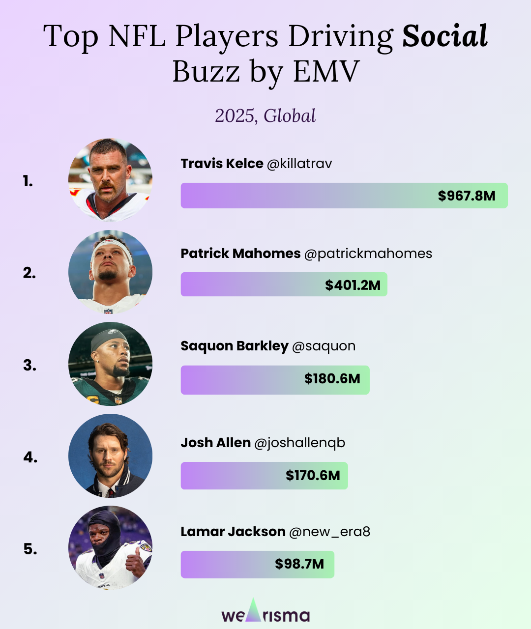 Social buzz isn’t always tied to on-field performance. Players like Travis Kelce saw major engagement spikes in 2025 driven by cultural moments off the field, while rising stars like Josh Allen gained momentum through increased media value and influencer conversation.