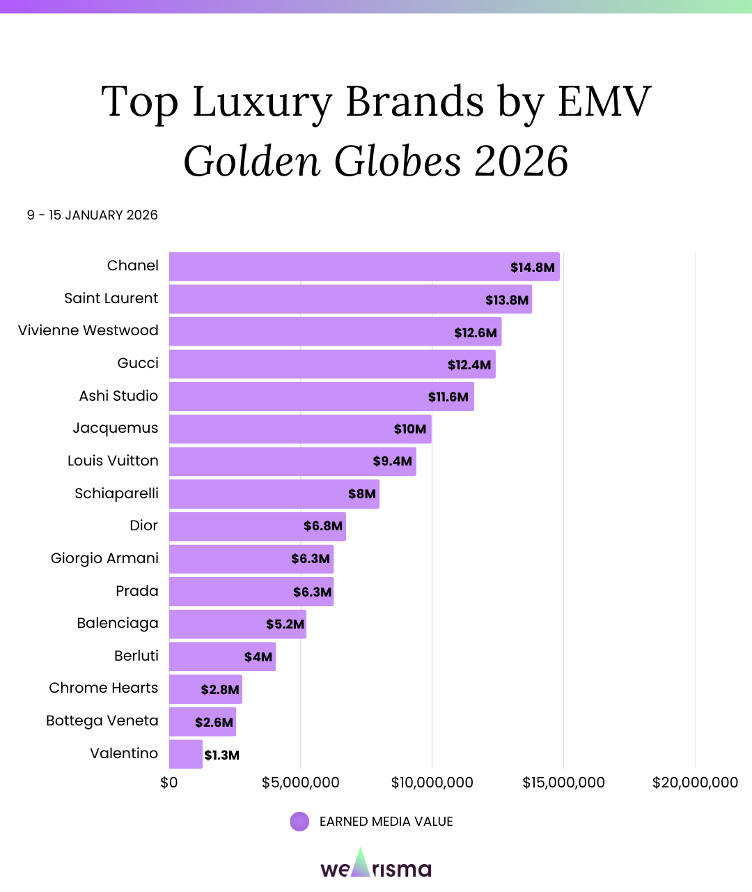 Using Wearisma’s AI-powered data, we analysed brand performance across 9–15 January 2026 to uncover which fashion houses generated the greatest measurable impact, based on Engagement, Earned Media Value (EMV) and Mentions, and the talent strategies behind their success.